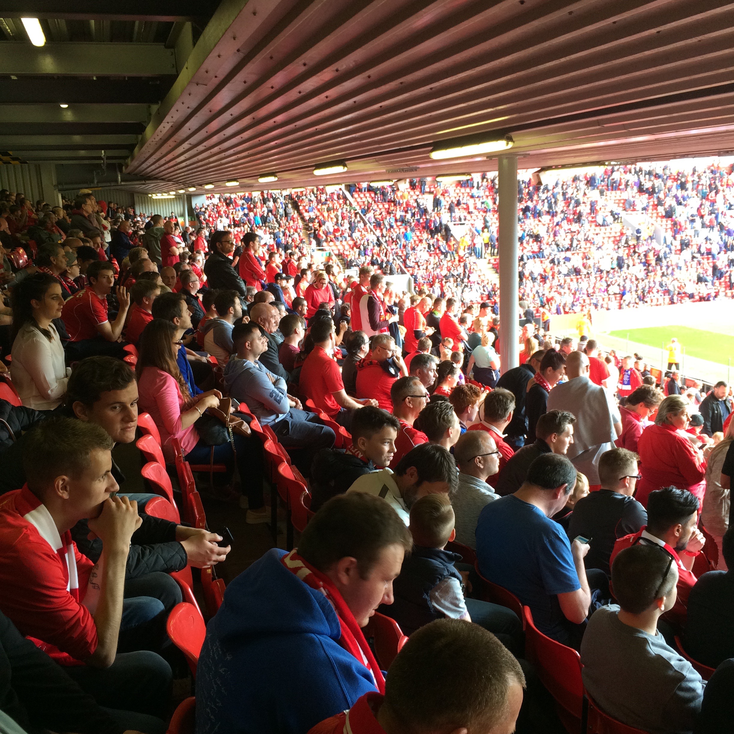 ใกล้เริ่มแล้วฮะ คนเริ่มทยอยๆเข้านั่งประจำที่ ฝั่งที่ผมนั่งคือ ฝั่ง Anfield Road เราก็ไม่รู้เนอะว่ามันติดกับกองเชียร์ทีมเยือน(Aston Villa )ใจก็เริ่มหวั่นๆเหมือนกัน มันจะเป็นแบบไทยปะหว่า แพ้แล้วมาขว้างของใส่อะไรแบบเนี้ย แอบกลัวอะ (บรรยกาศเพลง YNWA ที่ถ่ายเก็บไว้)