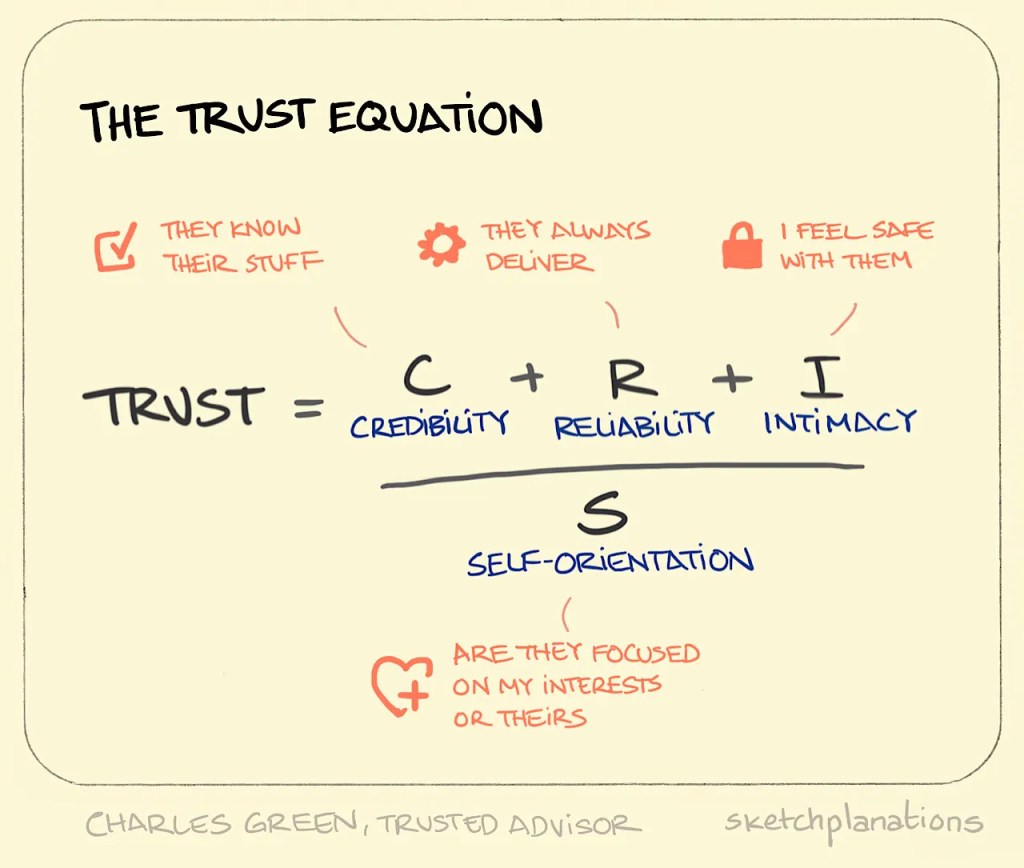 มีสมาการแห่งความเชื่อใจที่เรียกว่า Trust Equation คือ Trust = (C + R + I) / S ตามภาพด้านล่าง